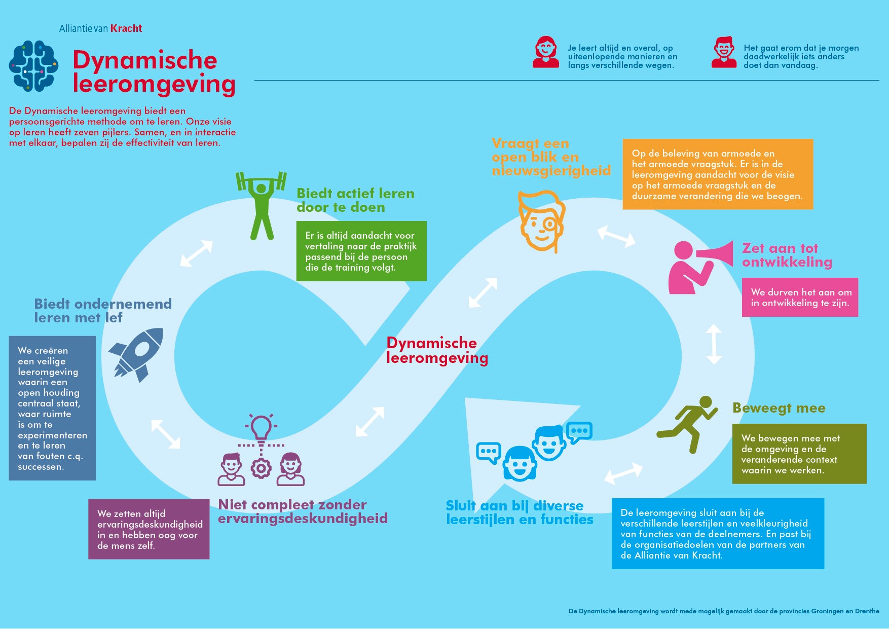De Dynamische leeromgeving gaat uit van 7 pijlers. Samen en met interactie van elkaar bepalen zij de effectiviteit van het leren. De Dynamische leeromgeving brengt in het leeraanbod bijeen in weten, doen, ervaren en veranderen (dit zijn de elementen waar iemand op kan zoeken, de filtering). Kijk en kies uit ons groeiend aanbod.